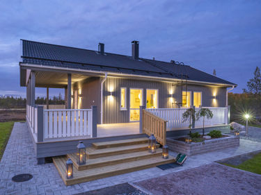 Tunnelmallinen julkisivu lisävalaistuksella! Vakiotoimitukseen kuuluu 2 julkisivuvalaisinta, mutta voit itse valita lisää niin monta kuin haluat.