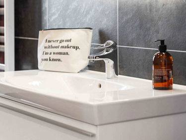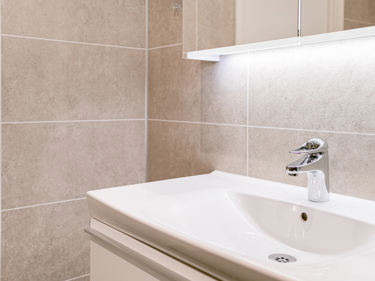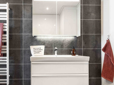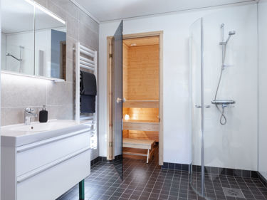 Valkorunkoinen peilikaappi led-valaistuksella. Alakaapissa on pehmeästi sulkeutuva laatikko, hylly ja pesuallas. Valkoista, kulutusta kestävää UV-lakkaa. Sekoitushana on mukana toimituksessa.
