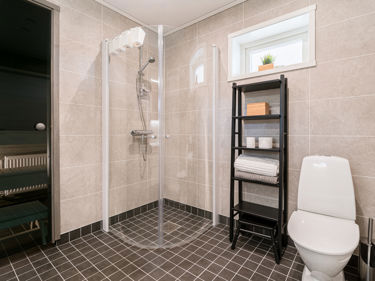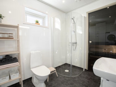 Valkoiset alumiiniprofiilit ja kirkas karkaistu turvalasi. Suihkuseinien ovet aukeavat sisään- ja ulospäin. Taittamalla ovet pesuhuoneeseen saadaan lisää tilaa.