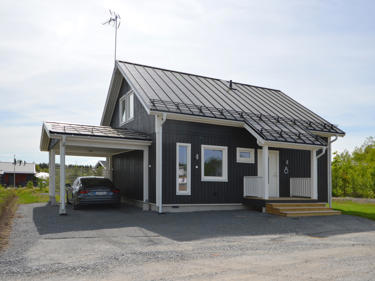 Katto: Kattokaltevuus 34° ja korotettu seinälinja, pystysaumakate ja integroitu sisääntulokatos
