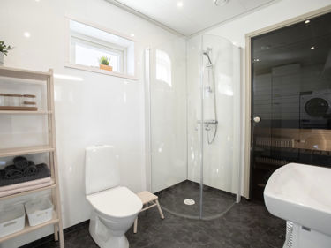 Vita aluminiumprofiler och härdat klarglas. Dörrarna kan öppnas inåt och utåt, och genom att vinkla dörrarna frigörs yta i badrummet.