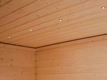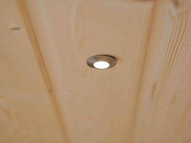 6 st infällda, dimbara LED-spotlights i bastu. Om bastufönster väljs ingår även en spotlight i fönstersmyg.