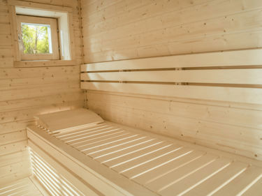 Bastupaketet omfattar insynsskydd mellan lavarna, ryggstöd, huvuddyna och ugnens skyddsräcke.