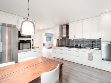 Välj vårt inbyggnadspaket med rostfri ugn, induktionshäll, mikrovågsugn, diskmaskin, kyl och frys (kombinerad kylfrys endast i husmodeller Siiri och Lasse).