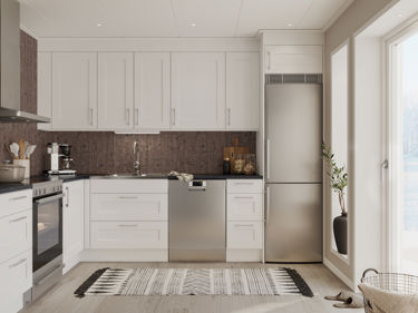 Välj vårt inbyggnadspaket med rostfri ugn, induktionshäll, mikrovågsugn, diskmaskin, kyl och frys (kombinerad kylfrys endast i husmodeller Siiri och Lasse).