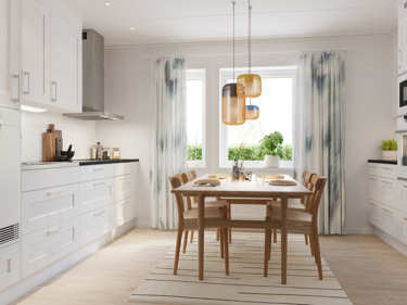 Den rymliga kombinationen av kök och vardagsrum är fritidshuspaketet Ainos pulserande hjärta som ger den effektivt planerade planlösningen en lyxig känsla. Aino har allt men inte för mycket.