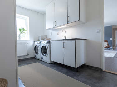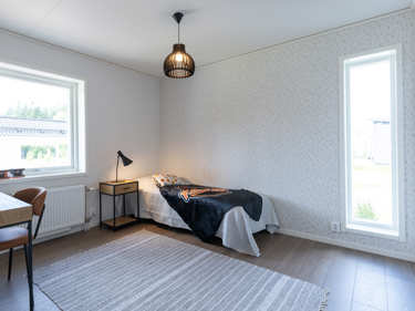 Husets stora klädvårds- och badrum, separat WC och klädrum underlättar en smidig vardag. Minnas rymliga planlösning med raka linjer gör småhusboendet eller fritidsbostaden en aning lyxigare, men sparsamt: Älvsbytalos energikostnader är låga.