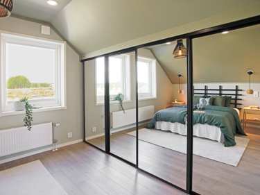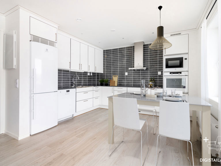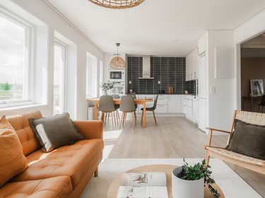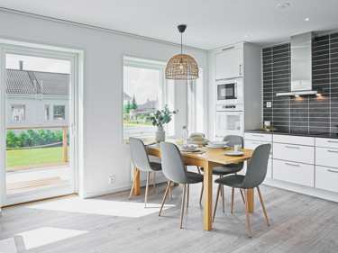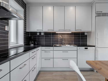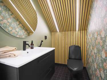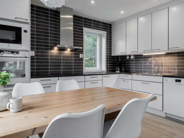 Det ljusa, öppna stugköket öppnar upp mot omgivningen och utgången direkt på gården. Det rymliga badrummet och en egen bastu sätter glans på vardagen.