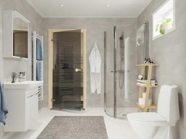 Klädvårdsrummet, badrummet och bastun är praktiskt placerade nära varandra i direkt anslutning till köket. Ingången till klädvårdsrummet är praktisk både för vardagliga sysslor som under bastudagarna. Förutom badrummet har huset en separat toalett i anslutning till sovrummen.