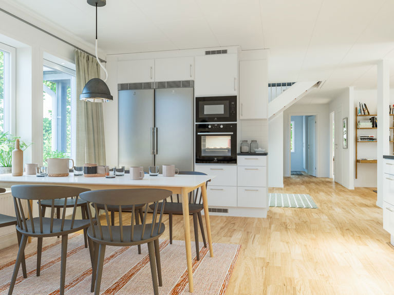 Köket är rymligt – som sig bör. Där finns plats för ett stort matbord, mycket ljud, härliga dofter och stämning. Vardagsrummet öppnar upp sig i anslutning till köket men med eget lugn. Från vardagsrummet kan man gå direkt ut på gården.