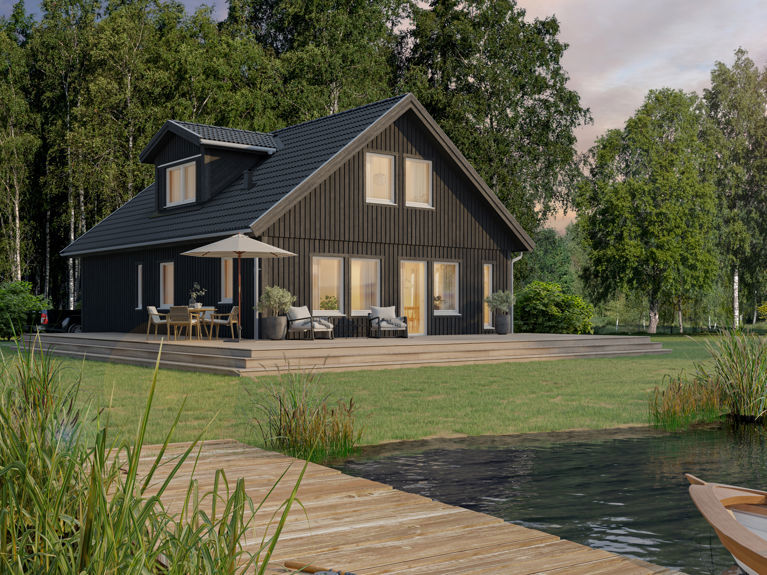 Fritidshuspaketet Alvar i 1,5-plan gör fritiden njutningsfull – för den egna familjen och gästerna. Nedre våningen är inflyttningsklar och där finns allt som behövs, inklusive klädvårdsrum. Till den förberedda övre våningen fås enkelt och förmånligt ytterligare utrymme.