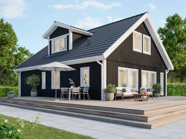 Med hjälp av över 150 tillval kan du modifiera Alvars funktioner och utseendet enligt dina egna önskemål. Ett av de mest populära tillvalen är gavelbalkongen som ger ett trivsamt och skyddat utrymme utomhus både som balkong i övre våningen och övertäckt terrass i nedre våningen.
