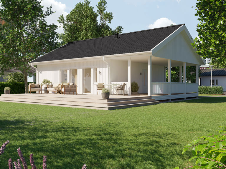 Allt detta finns i ditt lilla trähus: ett stort stugkök, två sovrum, klädrum, badrum, bastu och separat wc. Sådant är det häpnadsväckande stora, lilla Siiri 62,5 m².