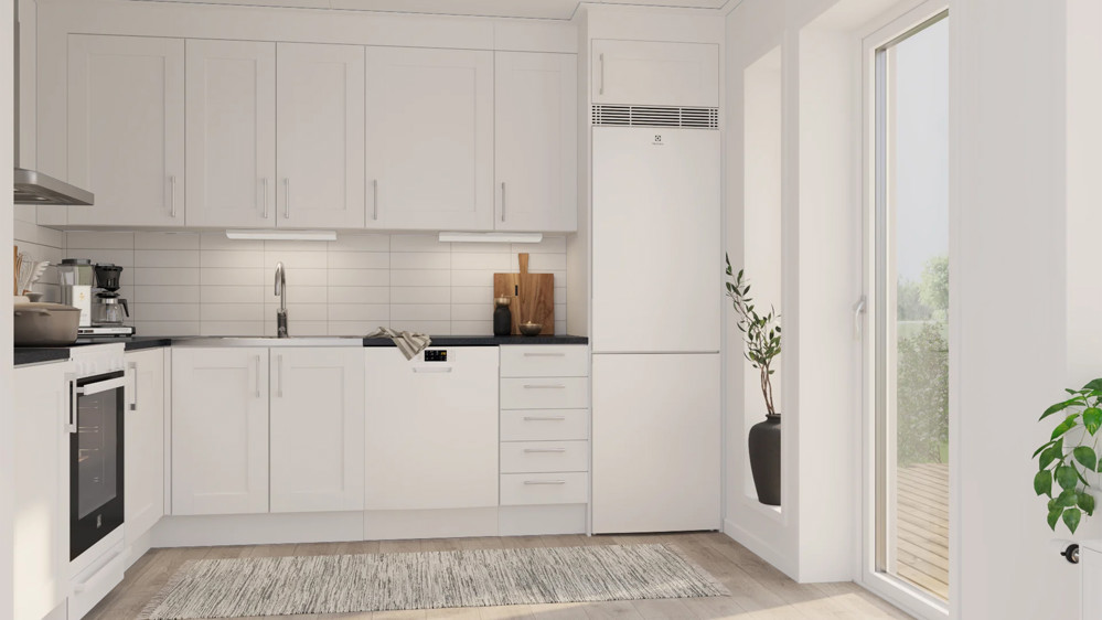 Det rymliga och ljusa stugköket gör det lilla Siiri överraskande rymligt. Från stugköket öppnar sig boendet direkt ut mot naturen och gårdsplanen – eller till den stora, övertäckta gavelaltanen på 28 m² om du så önskar.