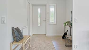 Mutta mitä näkyy lapsiperheen eteisestä? Tilaa, valoa ja avaruutta, ilman sekamelskaa. Heti pääsisäänkäynnin yhteydessä on vaatehuone, jonne ylimääräiset ulkovaatteet ja harrastevälineet on helppo sujauttaa. Kaksi muuta vaatehuonetta ovat makuuhuoneiden yhteydessä.