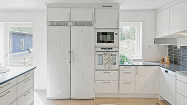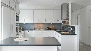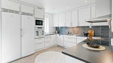 Sofian käytännöllinen, U-mallinen keittiö on siististi omassa kulmauksessaan olotilojen yhteydessä. Toimivassa keittiössä on reilusti laskutilaa ja ruokailun sijoittaminen on helppoa.