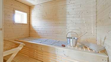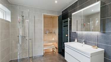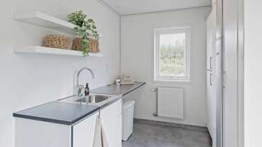 Keittiön ja olohuoneen välistä on käynti omaan pihaan. Ja silloin kun kotiinpaluuseen liittyy kuraisempaa kulkemista, esimerkiksi koiran tai lasten kanssa, on sauna–pesu–kodinhoitotilojen erillinen sisäänkäynti siihen mainio valinta. Sieltä löytyy myös lapsiperheessä olennainen toinen wc.