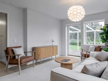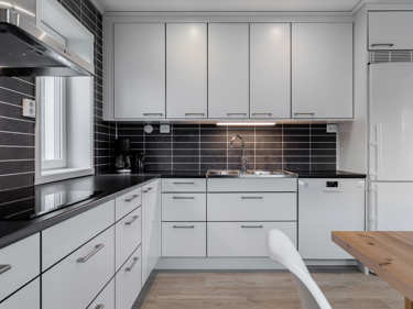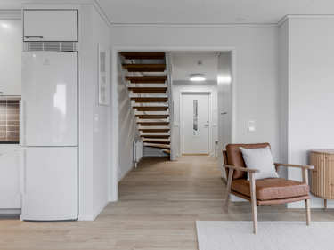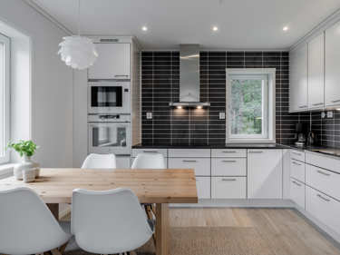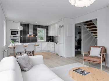 Valoisasta, avarasta tupakeittiöstä avautuvat maisema ja kulku suoraan pihamaalle. Väljä kylpyhuone ja oma sauna tuovat asumisen arkeen juhlan tuiketta.