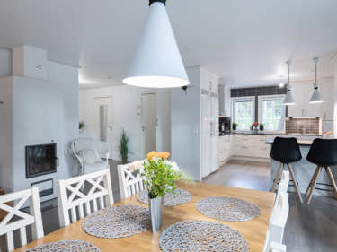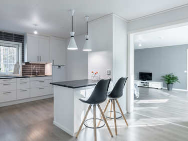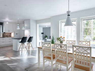 Tilava L-mallinen talopaketti tarjoaa monia mahdollisuuksia. Talomalli Toven tilat avautuvat keittiöstä kauniisti eri suuntiin – ruokailuun, olohuoneen elämään ja makuutilojen rauhaan.