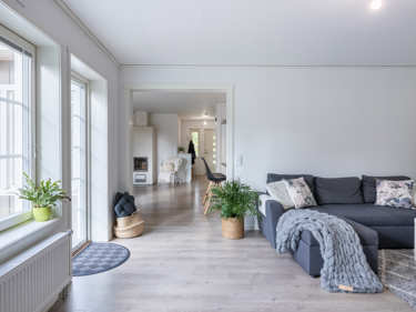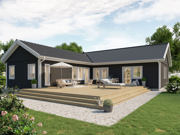 Muuttovalmiissa valmistalossa on vakiona kaksi kylpyhuonetta ja kodinhoitohuone sekä kolme makuuhuonetta, joista suurimmassa on tilava vaatehuone. Olohuoneen päätyyn voit valita lisähuoneen. Talon suojaisalle piha-alueelle pääsee astelemaan suoraan sekä makuuhuoneesta että olohuoneesta.