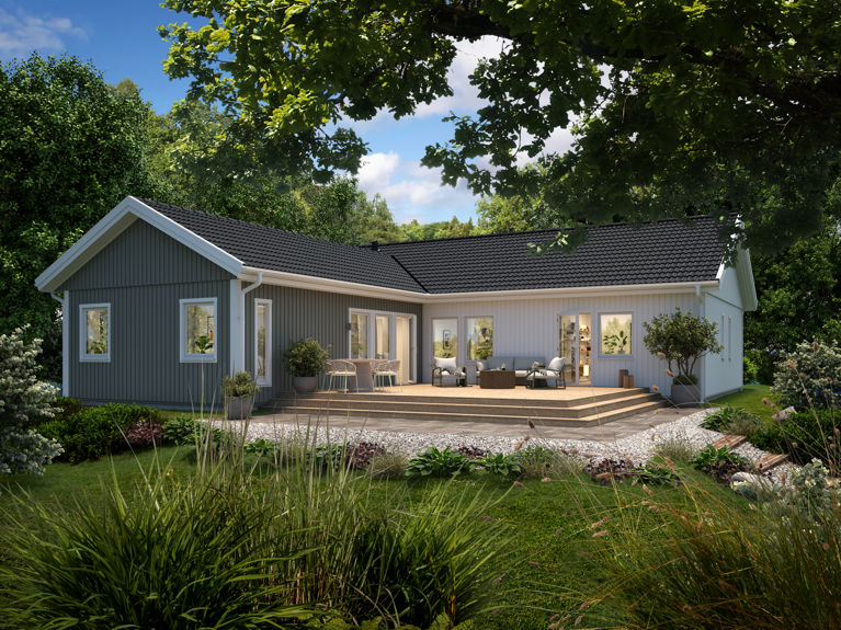 Valmistalo Toven tilat ovat hienosti yhdessä kerroksessa, mutta ulkotilat – niistä vasta saatkin hienot! L-malli jättää piha-alueen ainutlaatuisesti talosi syliin.